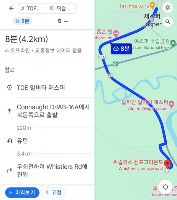 ▼위슬러 캠프그라운드를 입력하여 보면 Wi-Fi가 안되는 상황에서 폰에 저장된 오프라인 지도를 이용하여 경로가 표시된다.